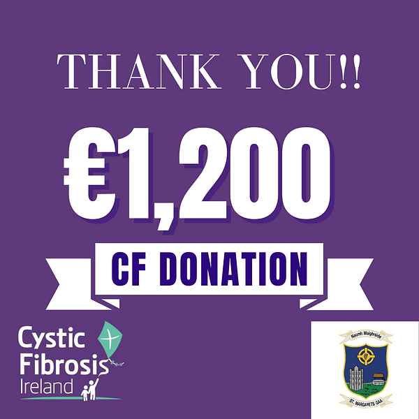 See MoreThe gate takings from our Men's Championship Match last Saturday will be donated to Cystic Fibrosis Ireland. A total of €1,200 was collected from St. Margarets and Garristown supporters. Thank you for your generosity.