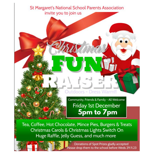 Start the month of December with a Christmas Fair. Come along to St. Margaret's NS Christmas Fundraiser. Everyone welcome. You might even catch a glimpse of Santa himself!