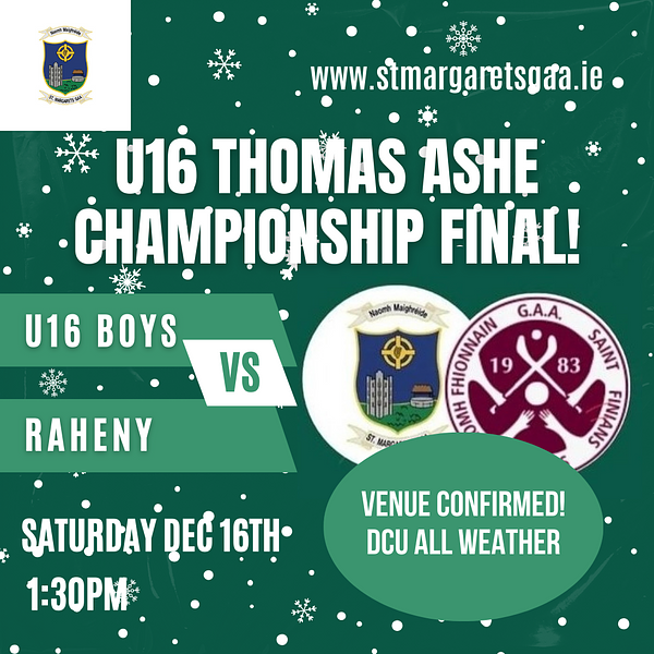 U16 Football Championship Final between Thomas Ashe & Raheny is confirmed for St Patrick's DCU All-Weather Pitch in Drumcondra tomorrow at 13:30.