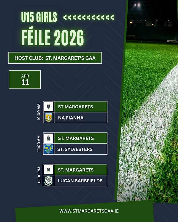 We’re proud to welcome clubs from across Dublin to St. Margaret’ GAA club on April 11th as our U15 girls take centre stage for this year’s Féile. It’s a brilliant day for our community to come together, support our players, and showcase everything that makes St. Margaret’s GAA special.