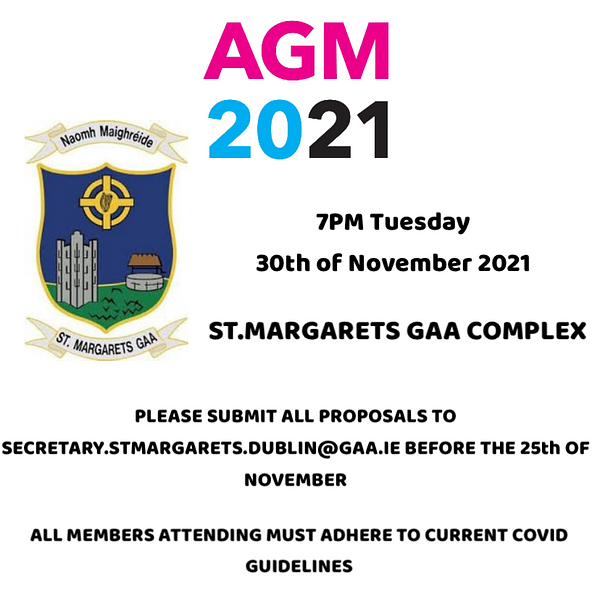 St.Margarets GAA AGM is taking place on Tuesday 30th of November 2021 @ 7pm